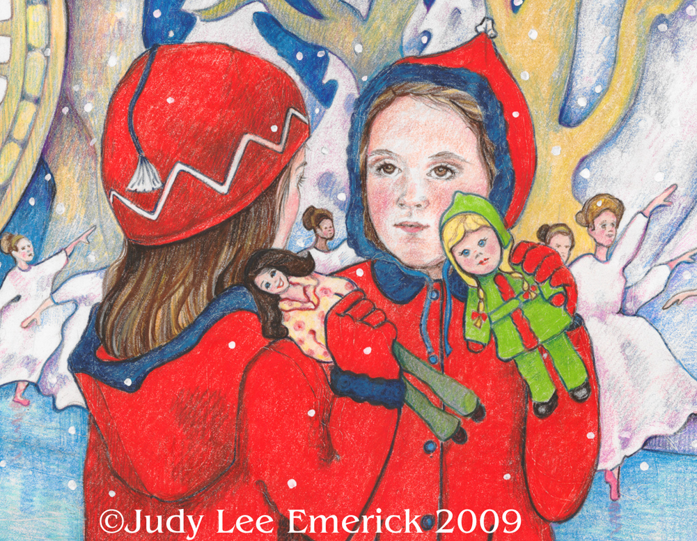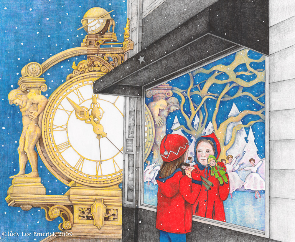 My "Recast" piece recounts a story of transition from Kaufmann's to Macy's. The celebrated Kaufmann's clock stands today as a symbol of the past, so I have chosen that familiar corner at Fifth and Smithfield where this icon is located. As the snow slowly begins to fall both inside the windows and out, the Pittsburgh Christmas holiday season commences. The clock strikes midnight beginning another day..another time. A small girl looks into the window scene, perceiving both a mirror image of herself and the image of a small girl from half a century ago. The girl of the past is dressed in clothing of the generation, and is holding a doll. This doll is the Ginny doll released in the 1950's, the same decade I was born. The girl looking into the window is my beautiful niece Julianne, and she is holding a doll released in 2007. In the current Macy's windows, we can see a scene from the Nutcracker Ballet. The golden winding limbs of the trees indicate the flow of time, just as the famous clock does. It reflects the blending of yesterday and today. Part of the corner clock on the building blends directly into the larger clock joining Time. The Macy's star shines brightly on the window awning, indicating a new beginning to a beloved tradition in our great city."